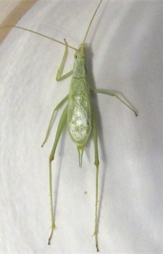 From my experiences, it seems that tree crickets are not strong fliers…but rather good leapers. They can’t jump like grasshoppers. They can fly…but not like a katydid (this will be covered in another month). Those that I have seen travel over a relatively long distance take a ‘flying leap’. This female Snowy tree cricket had been sleeved where a Snowy male had been singing 15 feet away for two nights. As soon as I removed the sleeve, she immediately pointed herself in his direction as he sang and took about five flying leaps to get to him.